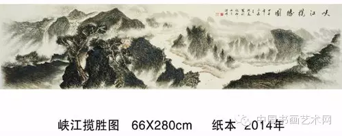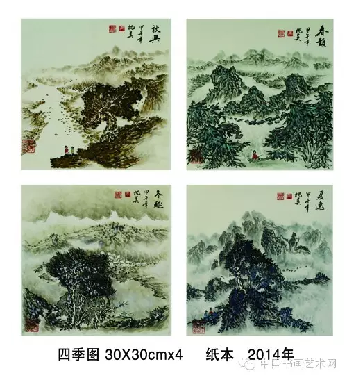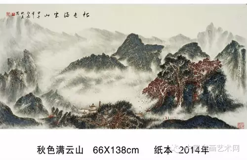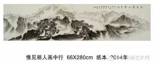 这次画展带给观众的《惟见丽人画中行》是他于2014年所创作的水墨山水。线性山水是他 擅长的笔墨技法,画面呈现山川形胜展开合拢之势,近处缓坡有仕女缓步雅集,中景有山涧急流,亭台楼阁,层峦叠嶂,所描绘的是祖国山水的幽然天趣,其景真情切,是他赞颂家乡之美的现代经典之名作。