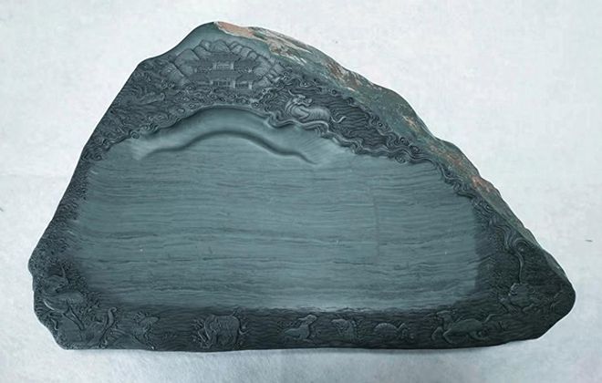 历经八载春秋,世界最大的洮砚“中华龙砚”于2012年制作成功,该砚长15.8米,宽3.28米,高1.68米,重约99吨。作为向党的十八大敬献的厚礼运往北京。这方恢宏壮观的巨砚,雕刻着姿态各异、腾跃欲飞的56条中华龙,砚台中心浮雕着中国版图,右侧为喷薄而出的朝阳,左侧为皎洁悦目的新月,勾勒出日月同辉的宏大气象。该砚上方是东起山海关、西至嘉峪关的万里长城,洋溢着中华民族不屈不挠的精神。