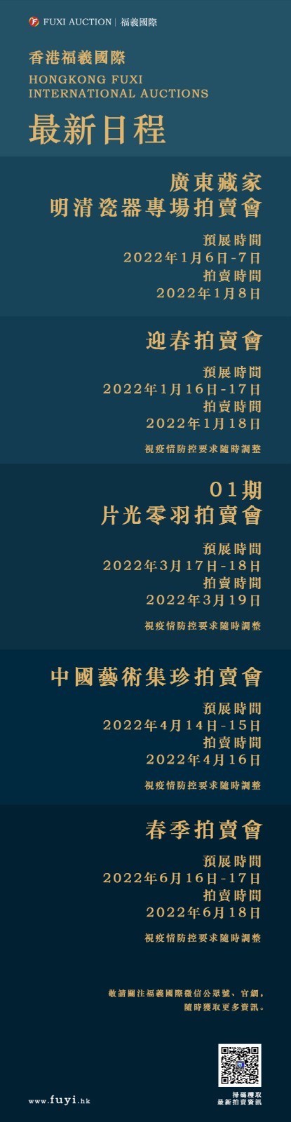 公司擁有豐富拍賣經驗,特別專註於明清瓷器、佛像及雜項研究,與重要藏家有著深厚的連繫,並對香港及海外拍賣市場瞭如指掌,在此感謝各位過去九年與福羲香港共同成長,2022年1月-6月經精心籌備,連續五場異彩紛呈、激情洋溢的高水平藝術盛宴將會陸續盛大登場,敬請各位繼續關註及支持。